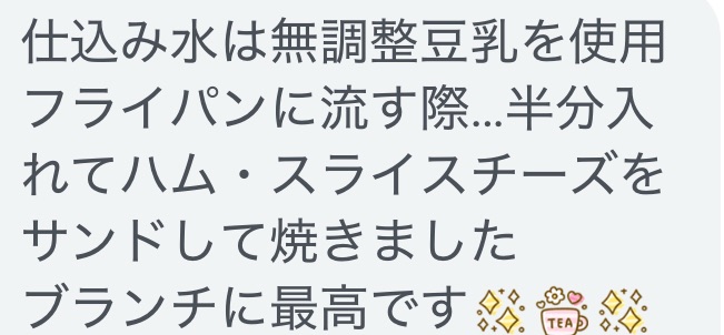 ・水30g追加=まずは160gスタート→生地が固ければ追加していくイメージ野菜は固形物の場合は、完全に「具材」という考え方なので=生地が完成してから混ぜ込んだり、生地をフライパンに流し込んで→具材いれて→生地をフライパンに流し込んで・・サンドイッチ方式でまぜたりします^^