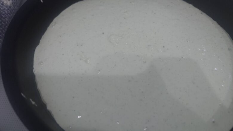 4:生地を流す水でぬらすのは、柔らかくしてフライパンの形にあわせるためです✨