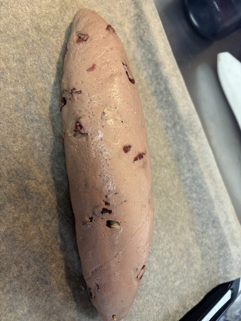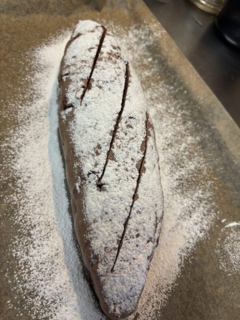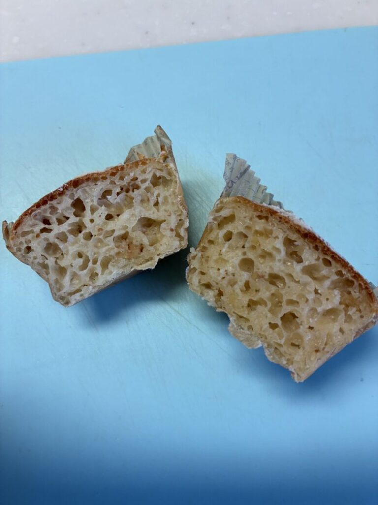 ・低温長時間発酵よりにする。小麦パンもそうなのですが低い温度で長時間発酵するとバゲットの気泡がはいりやすいといわれています^^今回は40度で早々と焼いたので、35度にして穴や表面でこぼこ感がはいるまでのんびり発酵をまつのもいいですね。成形して発酵しはじめて〜焼く直前まで30分ほどあると良さそうです!