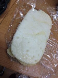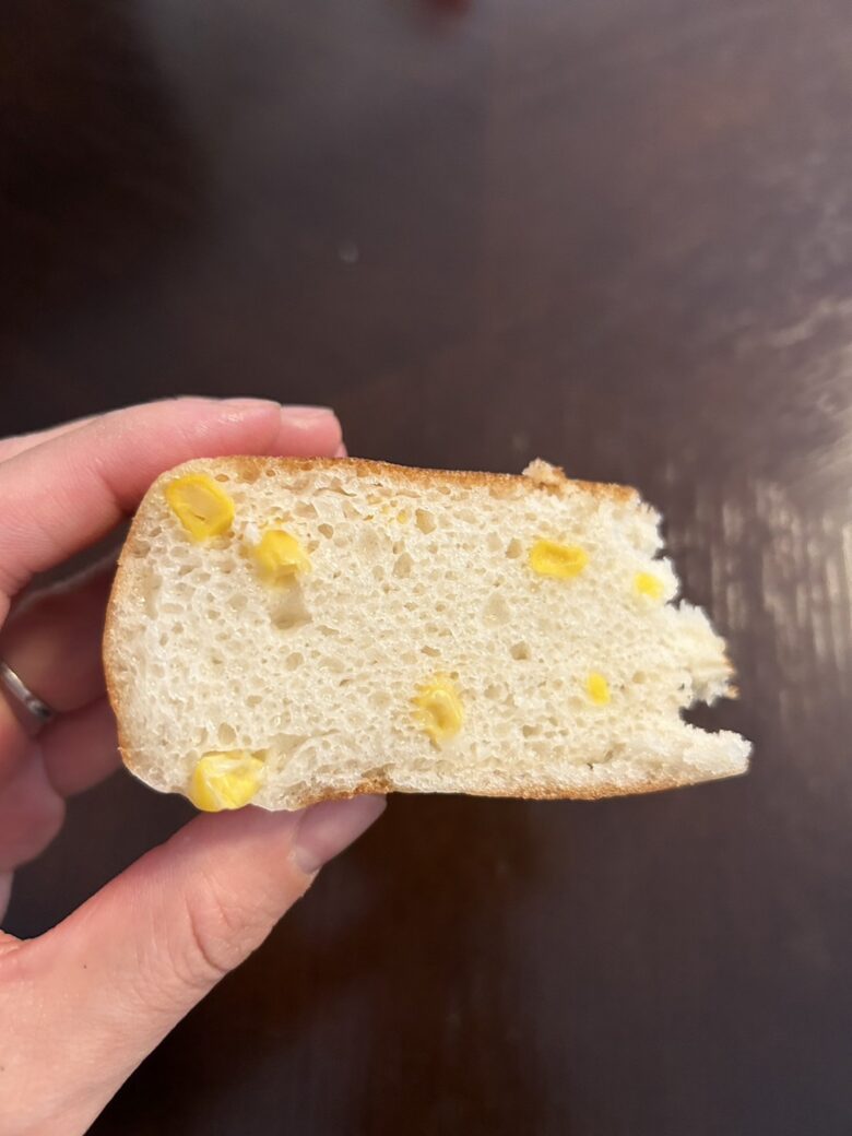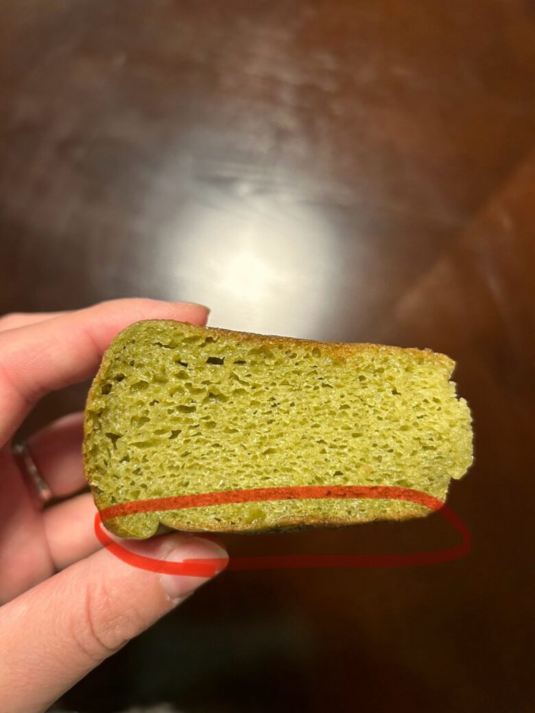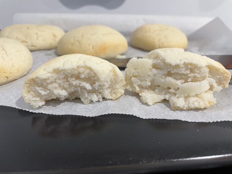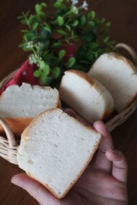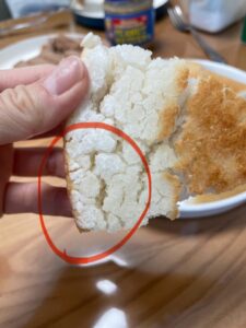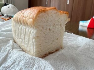 米粉パンのイースト入れ忘れ(気づいてあとから追加)は、焼きたては食べられる食感ですが、2時間ほどたつと歯にねちっとくっついて歯切れがわるくなります。